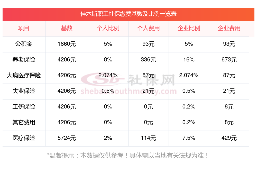 2025年佳木斯社保缴费最低基数及个人和单位具体是多少钱?下表是2025年佳木斯社保费用明细参考,新社通app-社保缴费查询工具提供的最新数据如下: