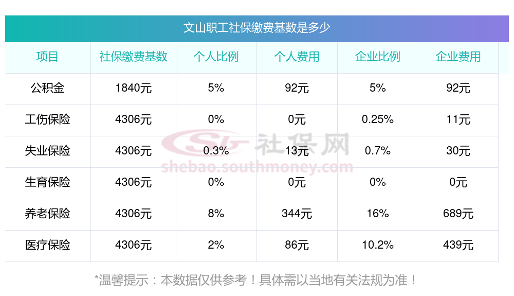 2025社保交多少钱?下表是2025年文山社保费用明细参考,新社通app-社保缴费查询工具提供的最新数据如下: