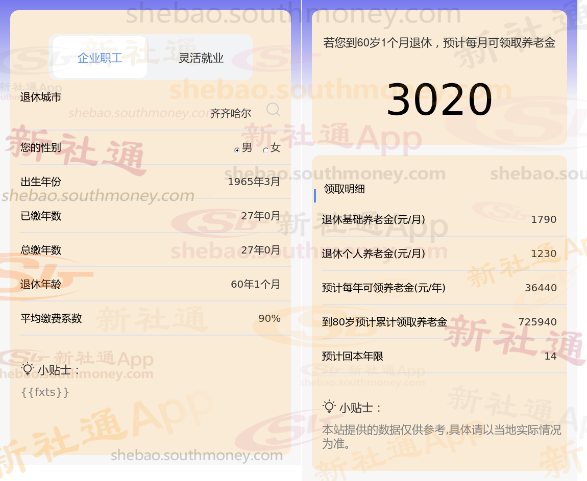 网友希某退休城市在齐齐哈尔,性别:男,出生年份:1965,总缴年数27年,缴费档次:90%,新社通app养老金计算器所得: