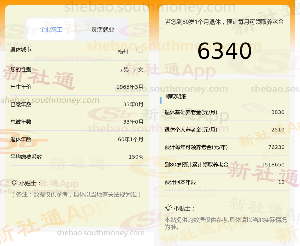 退休城市:梅州,性别:男,出生年份:1965,总缴年数33年,缴费档次:150%,新社通app养老金计算器所得: