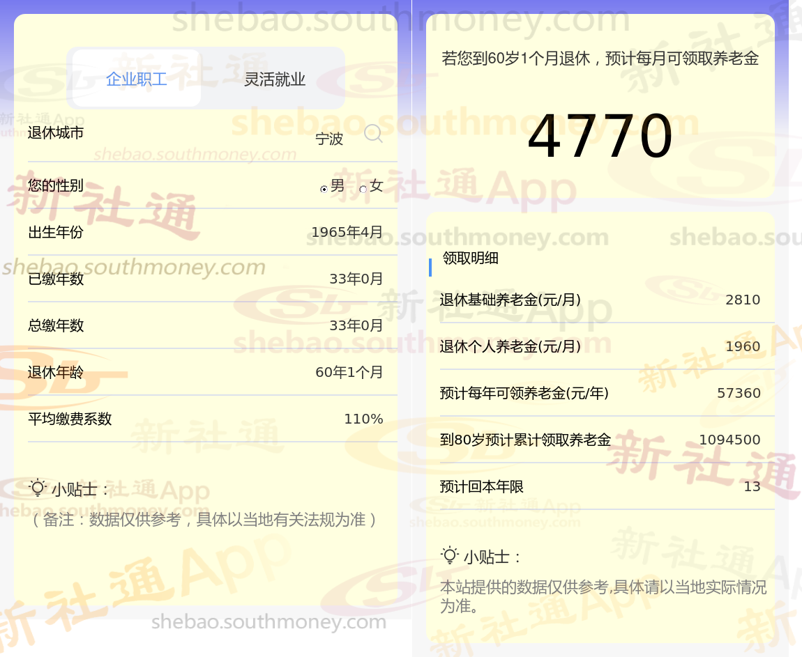 退休城市:宁波,性别:男,出生年份:1965,总缴年数33年,缴费档次:110%,新社通app养老金计算器所得: