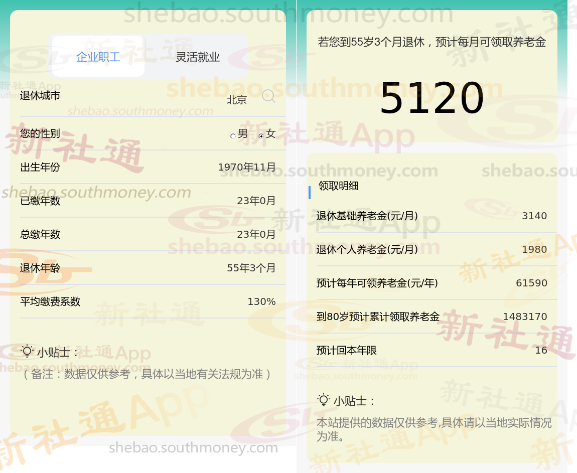 个人档案:女性,1970年出生,北京退休职工,社保缴费23载,档次130%。