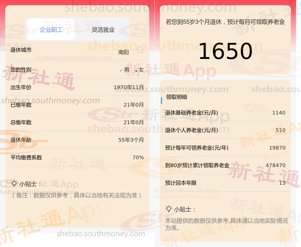 这是一位1970年出生的女性退休职工的个人档案,她来自南阳,已缴纳社保21年,且缴费档次为70%。通过新社通app养老金计算器得出: