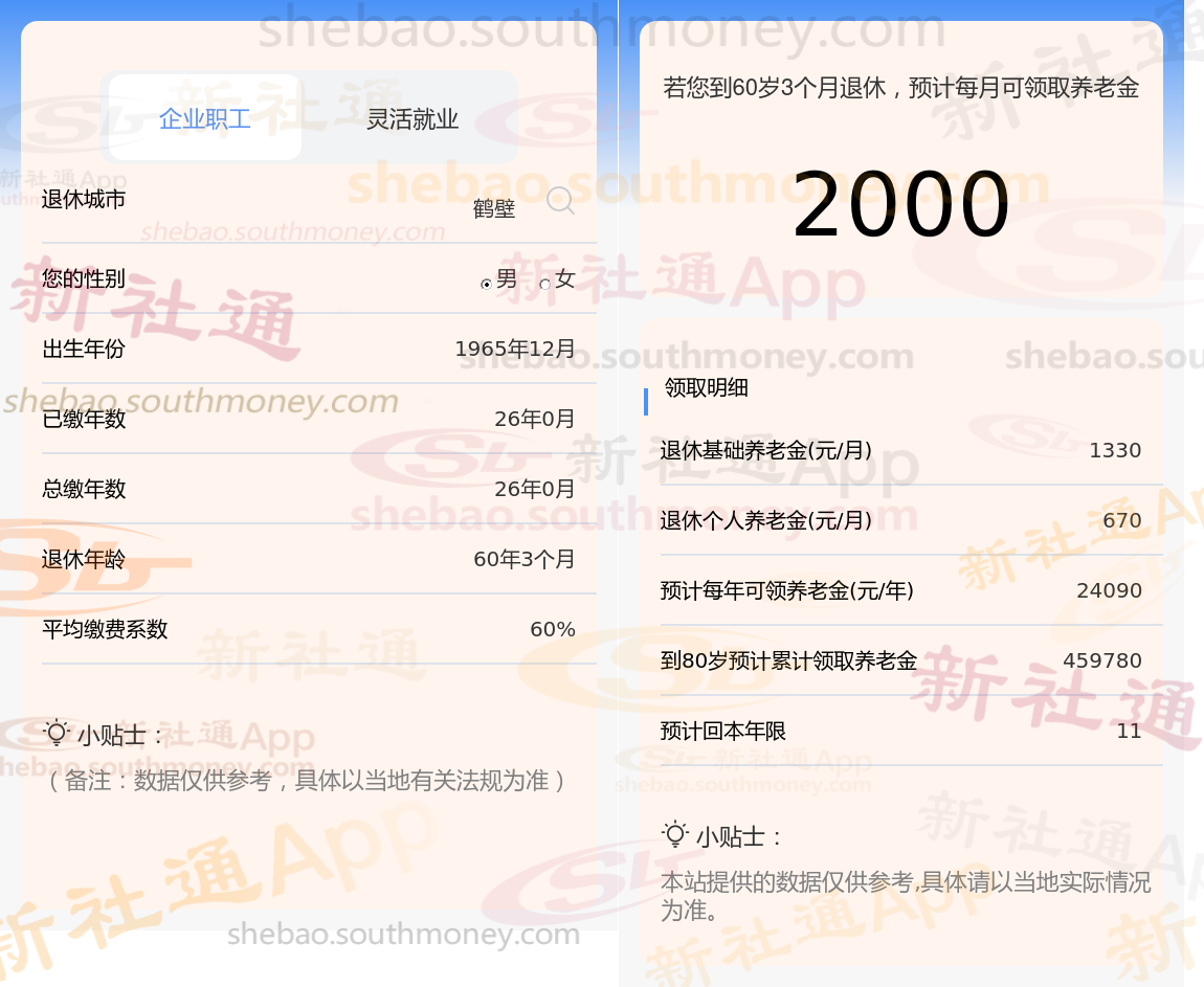 朋友孔某退休城市在鹤壁,性别:男,出生年份:1965,总缴年数26年,缴费档次:60%,新社通app养老金计算器所得: