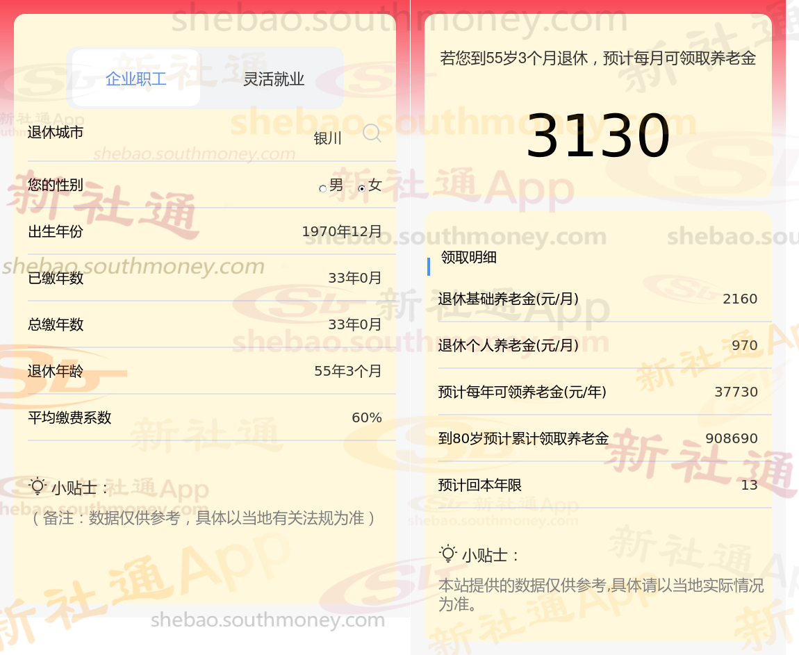 退休城市:银川,性别:女,出生年份:1970,总缴年数33年,缴费档次:60%,新社通app养老金计算器所得: