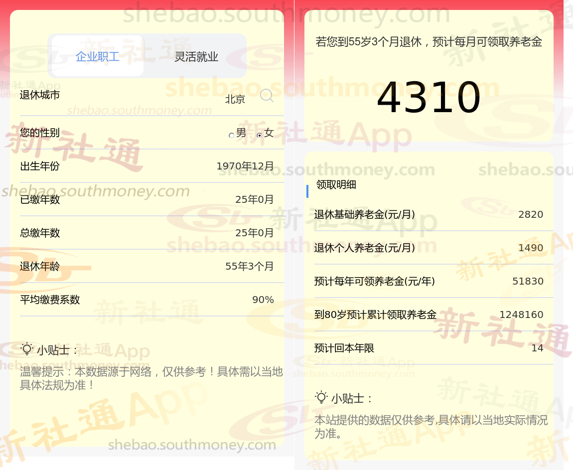 刘某,北京人,1970年出生,是一名拥有25载社保缴费年限的退休女性,缴费档次稳定在90%。岁月流转,她终于迎来了自己的退休时光。借助新社通app养老金在线计算器计算所得: