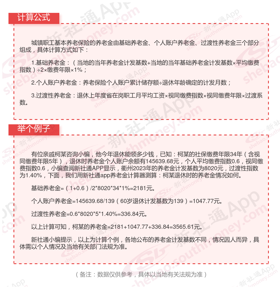 1.基础养老金:(当地的当年养老金计发基数+当地的当年基础养老金计发基数×平均缴费指数)÷2×缴费年限×1%;