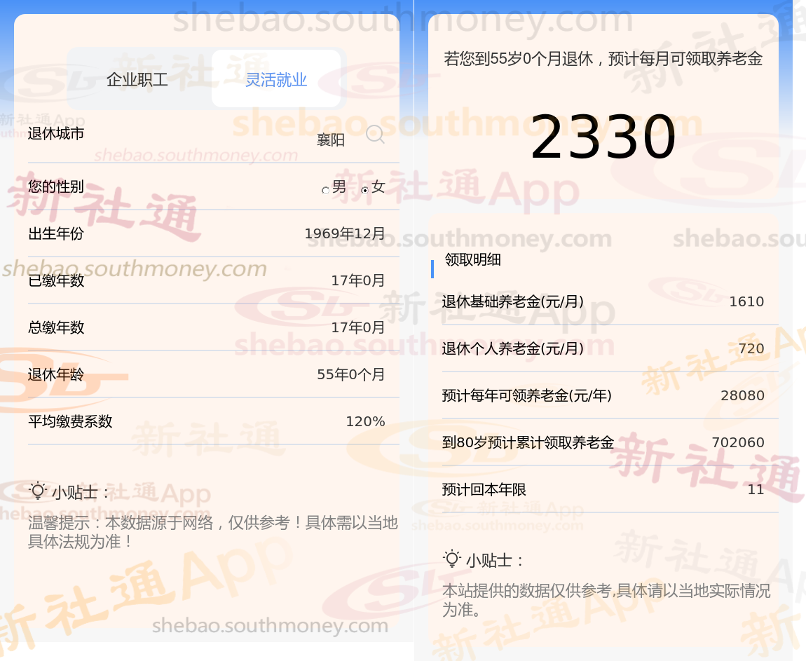 通过上面公式和新社君根据新社通app-社保缴费查询工具提供的最新数据一起来了解下,襄阳退休养老金怎么算?
