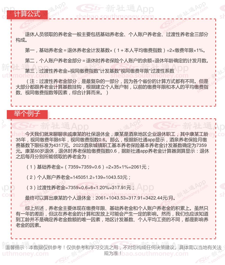 养老金计算方法说明 基础养老金的计算: 基础养老金按照参保人退休前一年本职工作月平均工资和参保人月平均缴费工资指数计算。