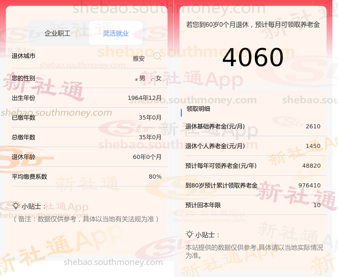 基于这些关键信息,我们使用新社通app养老金计算器对他未来的养老金进行了详细估算: