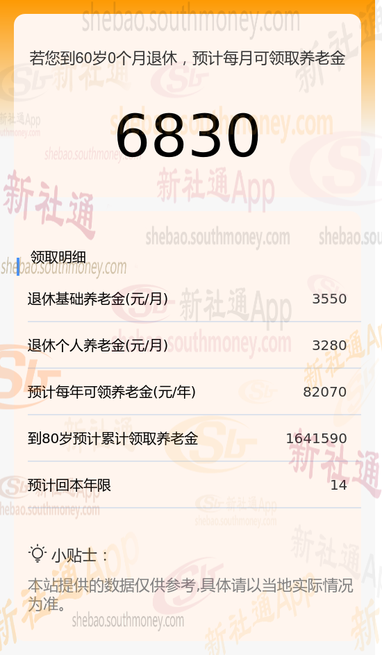 每月可领养老金=基础养老金+个人养老金≈3550+3280≈6830元。