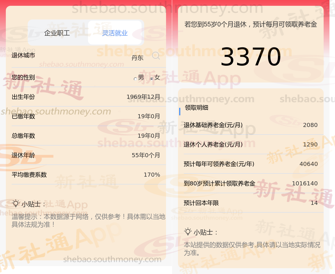 退休城市:丹东,性别:女,出生年份:1969,总缴年数19年,缴费档次:170%,新社通app养老金计算器所得: