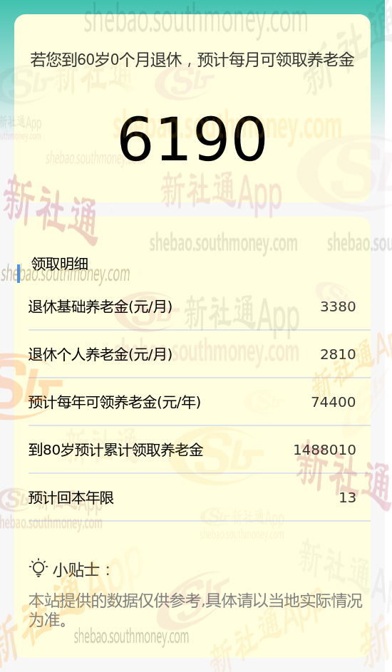 养老金总和:基础养老金 + 个人养老金 =3380元+2810元 ≈6190元/月。
