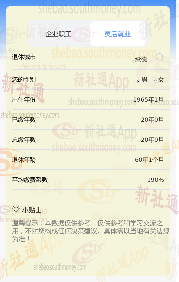 退休城市:承德,性别:男,出生年份:1965,总缴年数20年,缴费档次:190%