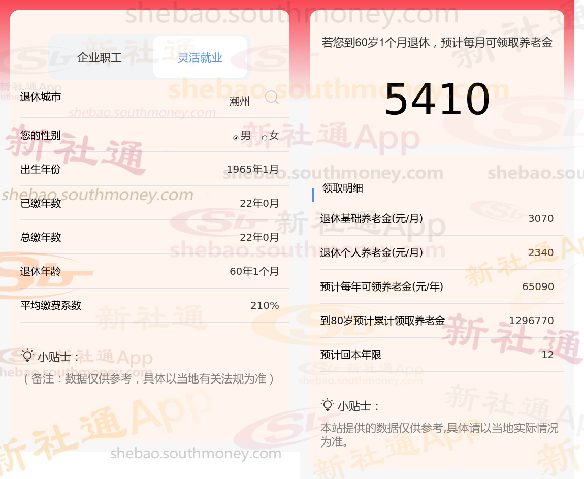 通过上面公式和社保网app根据新社通app-社保缴费查询工具提供的最新数据一起来了解下,潮州退休养老金怎么算?