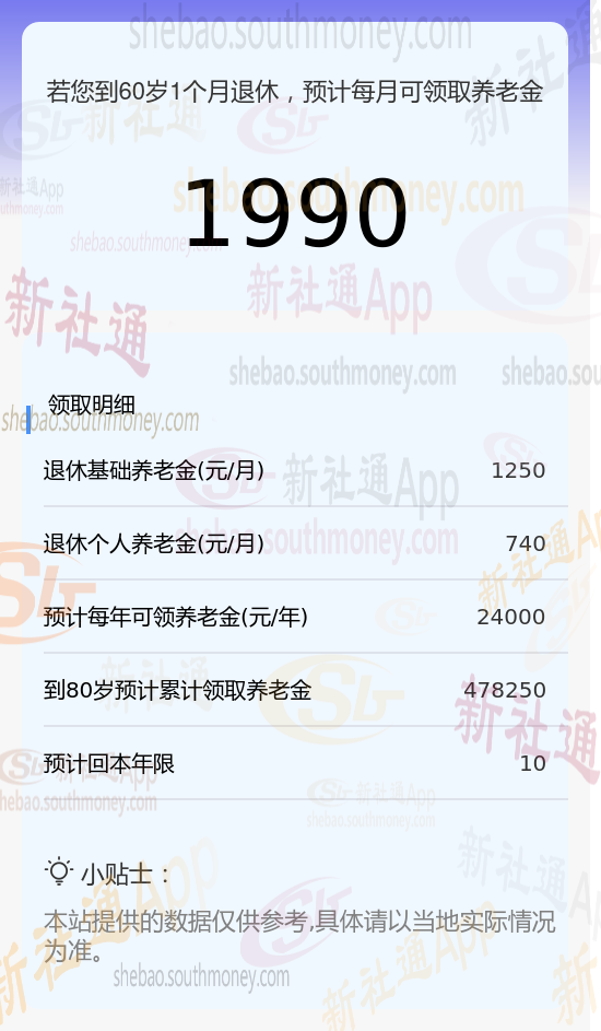 基础退休工资:基本养老金=当地上年度在岗职工月平均工资×20/100 实际缴费工资累计额的11%/10年×12月(/代替除号)。通过公式计算出每月大约1250元。