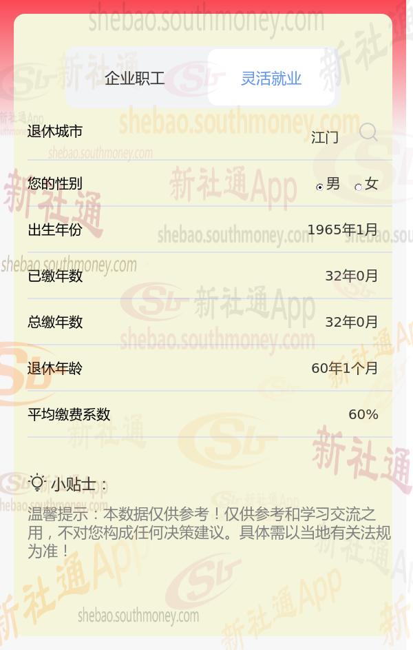退休城市:江门,性别:男,出生年份:1965,总缴年数32年,缴费档次:60%