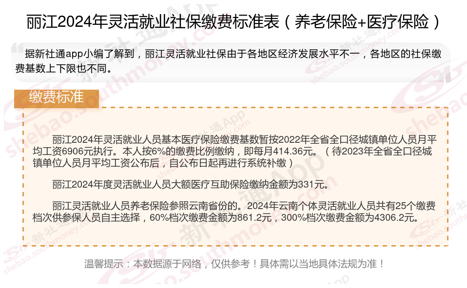 据新社通app数据显示,丽江灵活就业人员养老保险缴费基数2024-2025年最新标准如下: