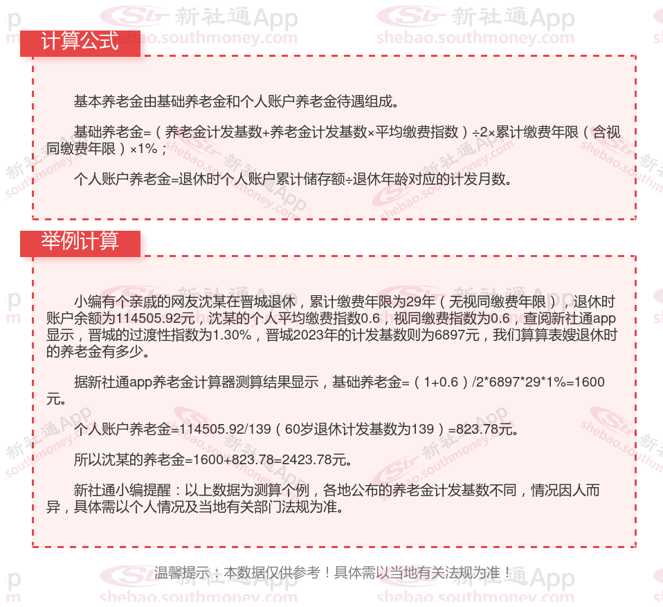 基本养老金计算公式为:(退休时上年度全市城镇单位就业人员月平均工资+本人指数化月平均缴费工资)÷2×缴费年限×1%。