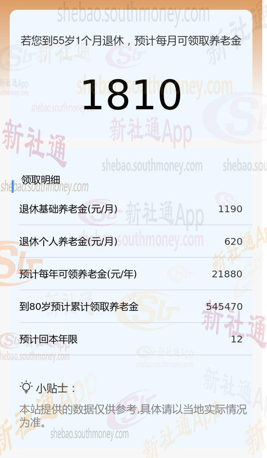 社保按80%档次缴费的朱某,昌吉城市退休,出生于1970年,工龄16年,女性。岁月流转,她终于迎来了自己的退休年龄。根据新社通app养老金在线计算器计算所得: