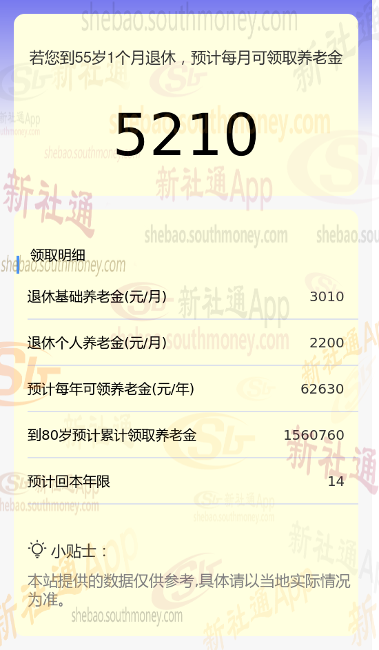 每月可领养老金总额:将基础养老金与个人养老金相加,每月可领取的养老金总额约为5210元(3010元+2200元)。