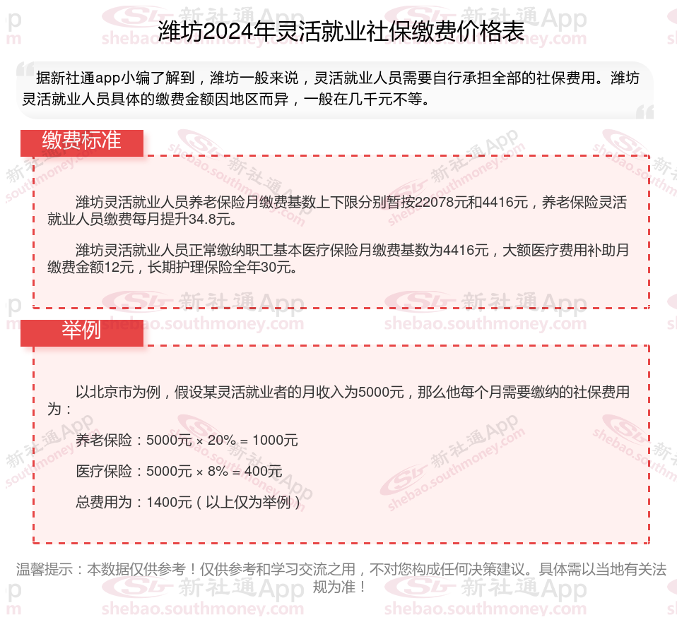 据新社通app数据显示,潍坊灵活就业人员养老保险缴费基数2024-2025年最新标准如下: