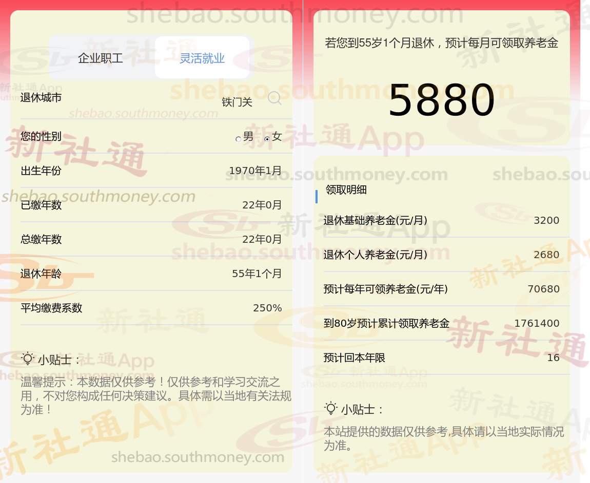 张某是一位女性,1970年出生,现已退休。她居住的城市是铁门关,在职业生涯中,她累计缴纳了22年的社会保险,缴费档次为250%。