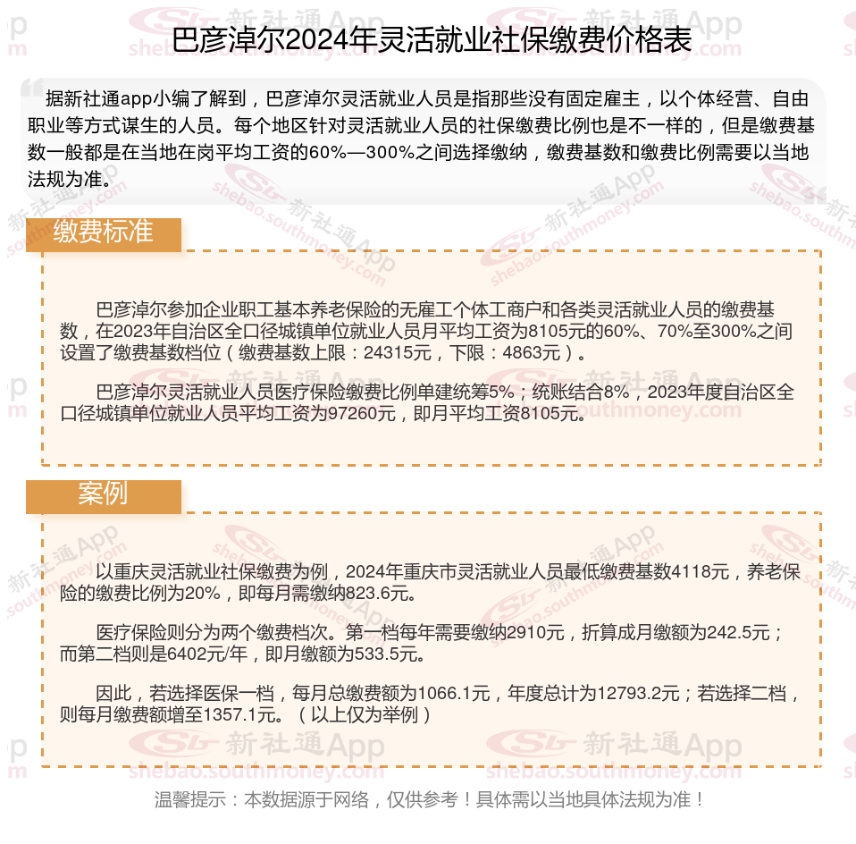 据新社通app数据显示,巴彦淖尔灵活就业人员养老缴费基数2024-2025年最新标准如下: