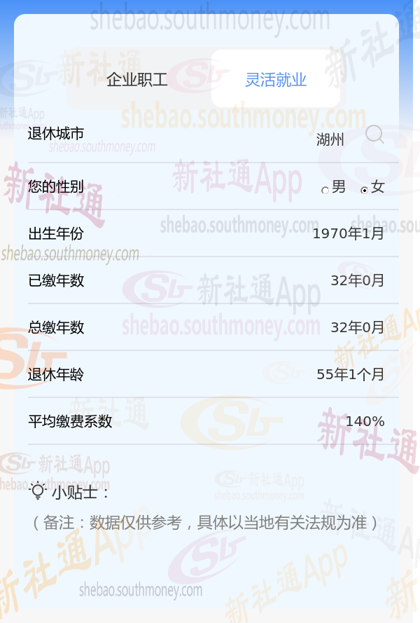 张某是一位女性,1970年出生,现已退休。她居住的城市是湖州,在职业生涯中,她累计缴纳了32年的社会保险,缴费档次为140%。