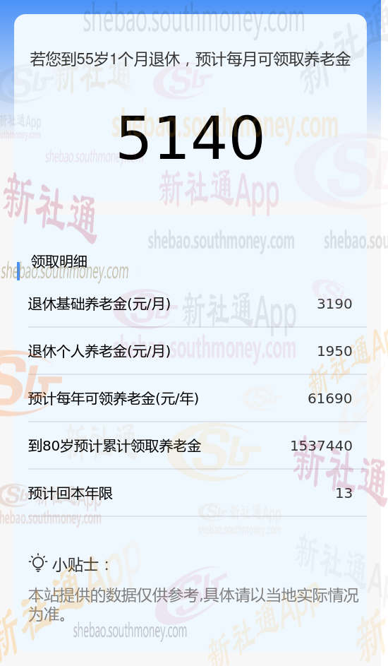 基础养老金:基础养老金:其计算公式为(全省上年度在岗职工月平均工资+本人指数化月平均缴费工资)÷2×缴费年限×1%。其中,本人指数化月平均缴费工资=全省上年度在岗职工月平均工资×本人平均缴费指数(本人平均缴费指数最高为300%,最低为60%,指数在0.6~3之间)。通过公式计算出每月大约3190元。