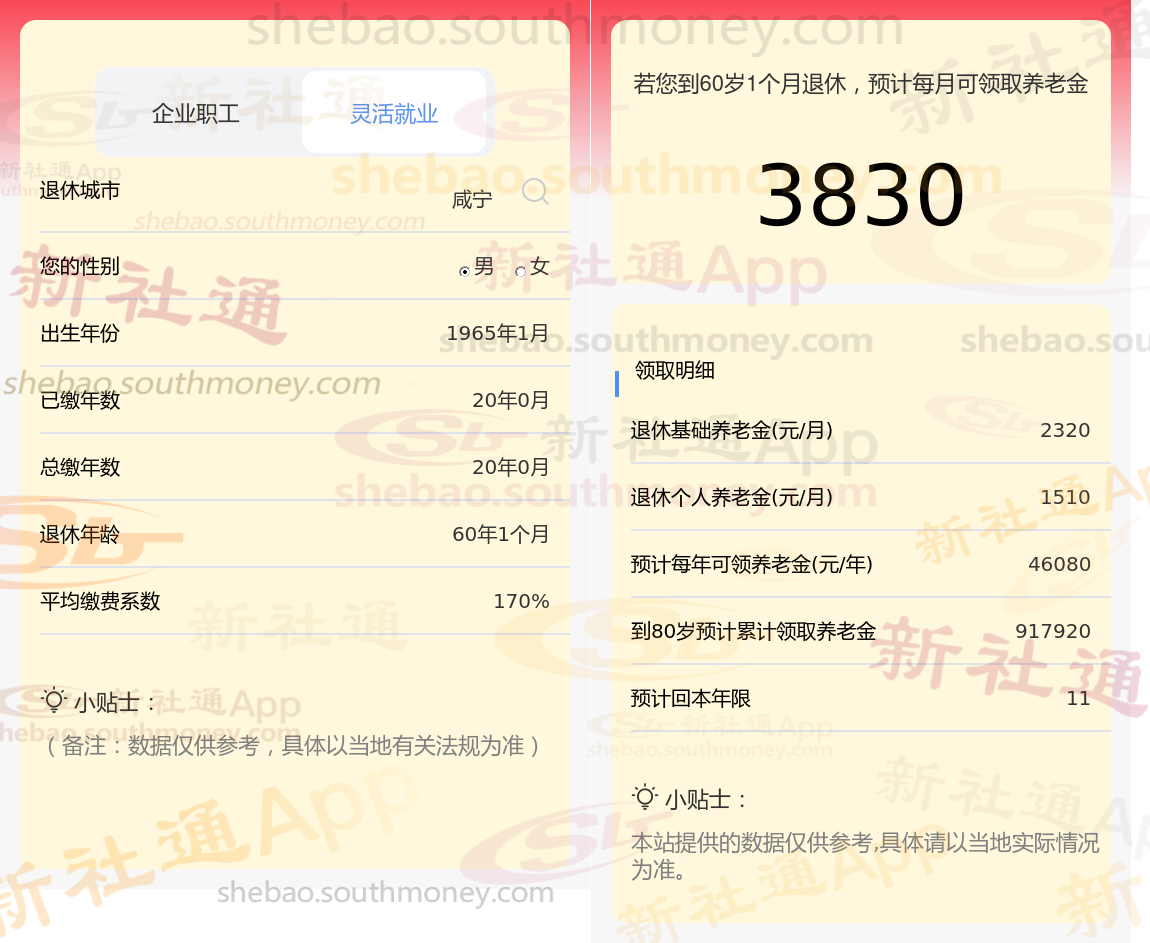 退休城市:咸宁,性别:男,出生年份:1965,总缴年数20年,缴费档次:170%,新社通app养老金计算器所得: