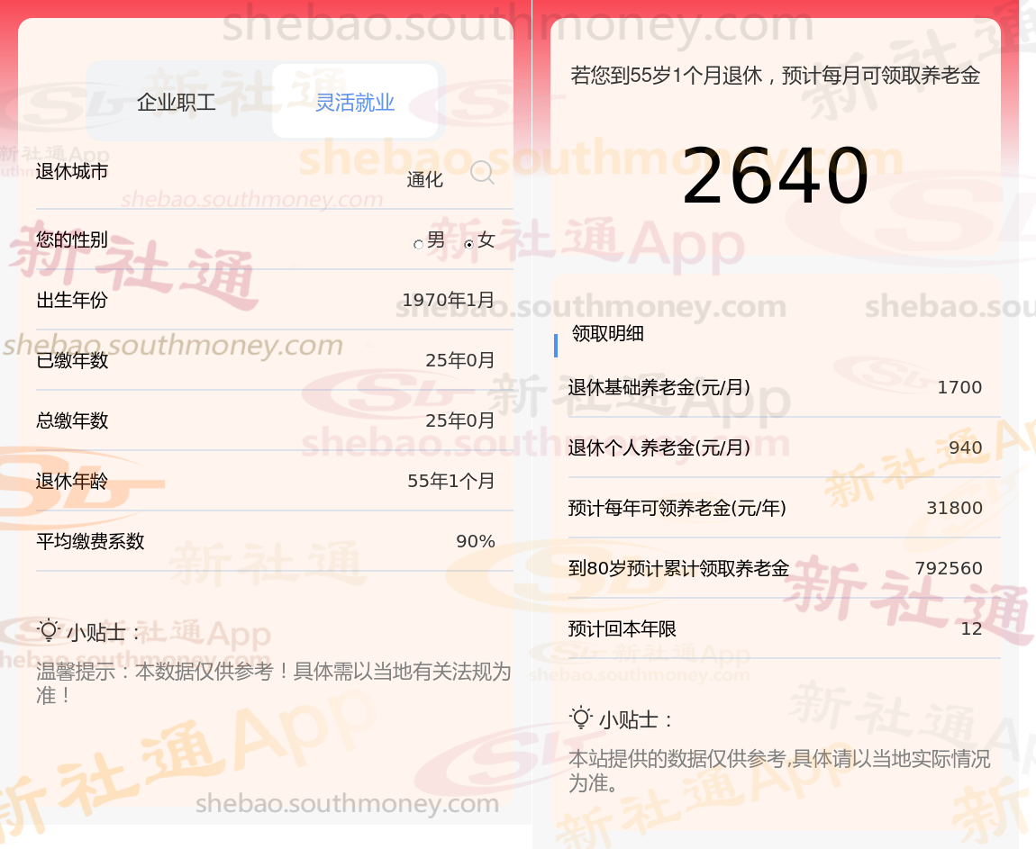 希某,作为一位勤勉的职工,他的养老保险缴纳记录长达25年之久,且缴费档次一直保持在较高的90%水平。基于这些关键数据,我们利用新社通app养老金计算器,结合最新的养老保险法规,对其养老金进行了如下估算: