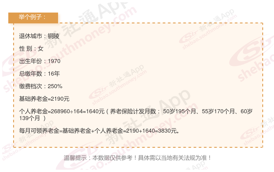 个人基础信息:女性,1970年出生,铜陵退休人士,拥有16年的缴费年限,缴费档次为250%。