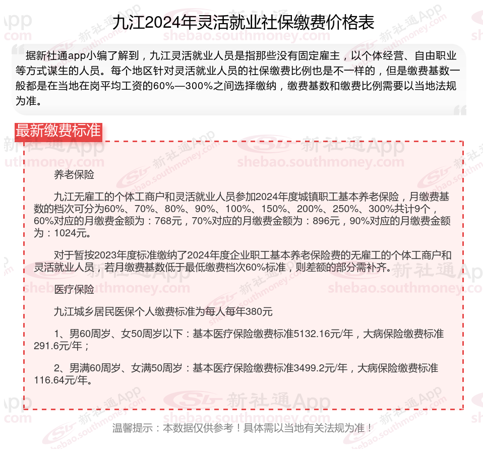 据新社通app数据显示,2024-2025年九江灵活就业人员养老保险的缴费标准: