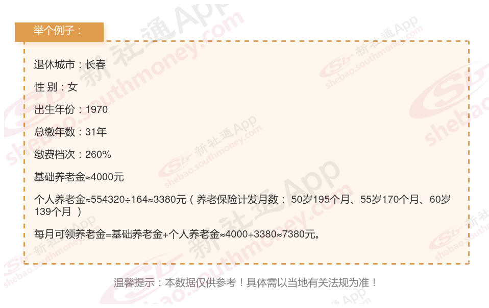 这是一位1970年出生的女性退休职工的个人档案,她来自长春,已缴纳社保31年,且缴费档次为260%。通过新社通app养老金计算器得出: