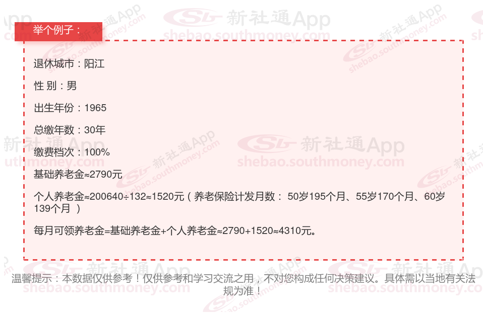 社保按100%档次缴费的张某,阳江城市退休,出生于1965年,工龄30年,男性。岁月流转,他终于迎来了自己的退休年龄。根据新社通app养老金在线计算器计算所得: