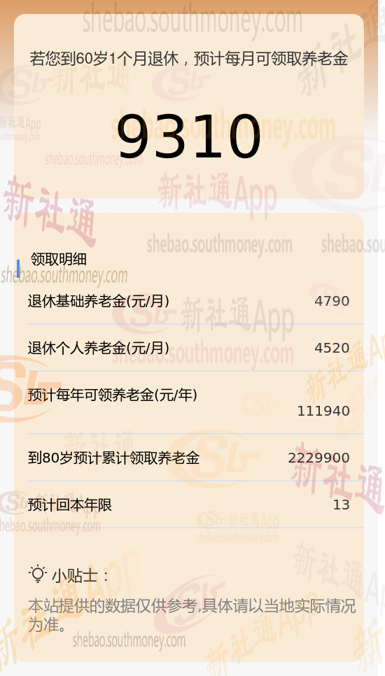 每月可领养老金总额:将基础养老金与个人养老金相加,每月可领取的养老金总额约为9310元(4790元+4520元)。