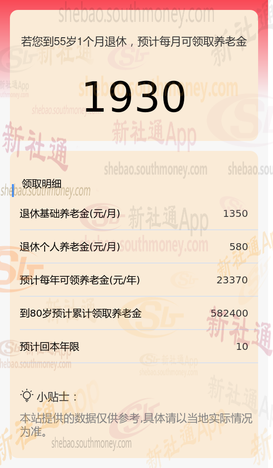 每月可领养老金=基础养老金+个人养老金≈1350+580≈1930元。