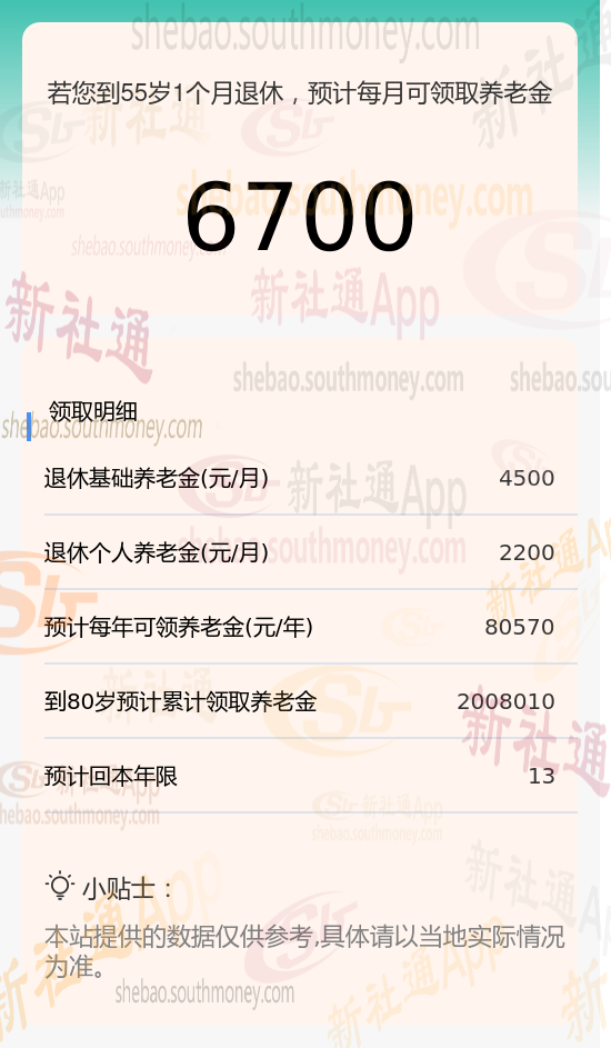 新社通app养老金计算器测算得出养老金可领取: