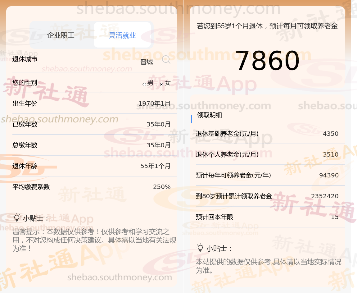 退休城市:晋城,性别:女,出生年份:1970,总缴年数35年,缴费档次:250%,新社通app养老金计算器所得: