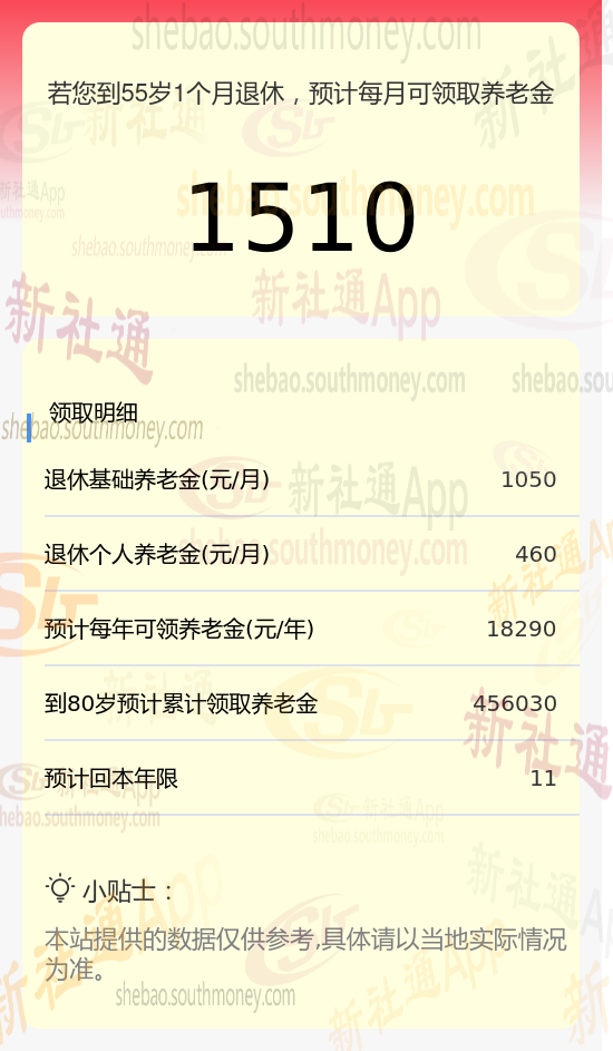 每月可领养老金总额:将基础养老金与个人养老金相加,每月可领取的养老金总额约为1510元(1050元+460元)。