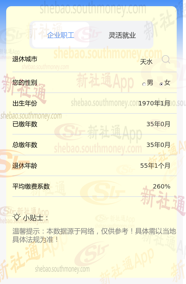 亲戚王某退休城市在天水,性别:女,出生年份:1970,缴费档次:260%为例,新社通app养老金计算器预设工资增长率等参数为3%。在此情境下,其退休后能领取的养老金数额需通过计算器精确得出,但基于上述条件,预计数额会相对较低。为获准确估算,建议王某使用计算工具按要求输入个人信息进行计算,具体数额依个人情况及当地法规而定。
