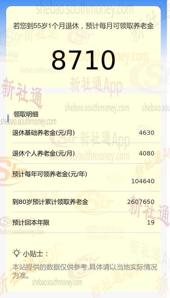 每月可领养老金=基础养老金+个人养老金≈4630+4080≈8710元。