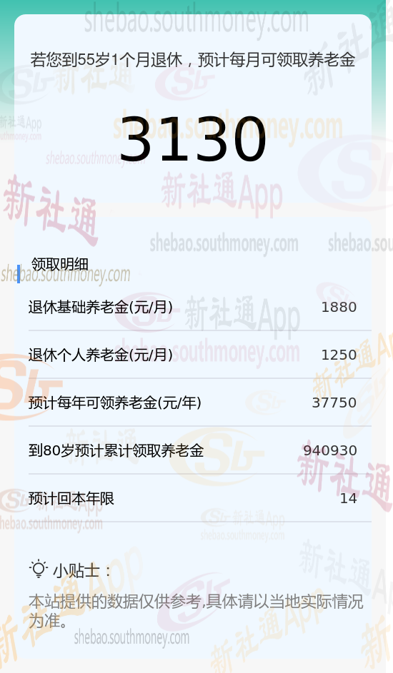 结果显示:他每月可以从个人账户中领取约1250元的养老金。将上述两部分相加,我们得出林某每月预计可以领取的养老金总额为3130元。这一结果是由新社通app养老金计算器基于给定的参数和公式得出的估算值。