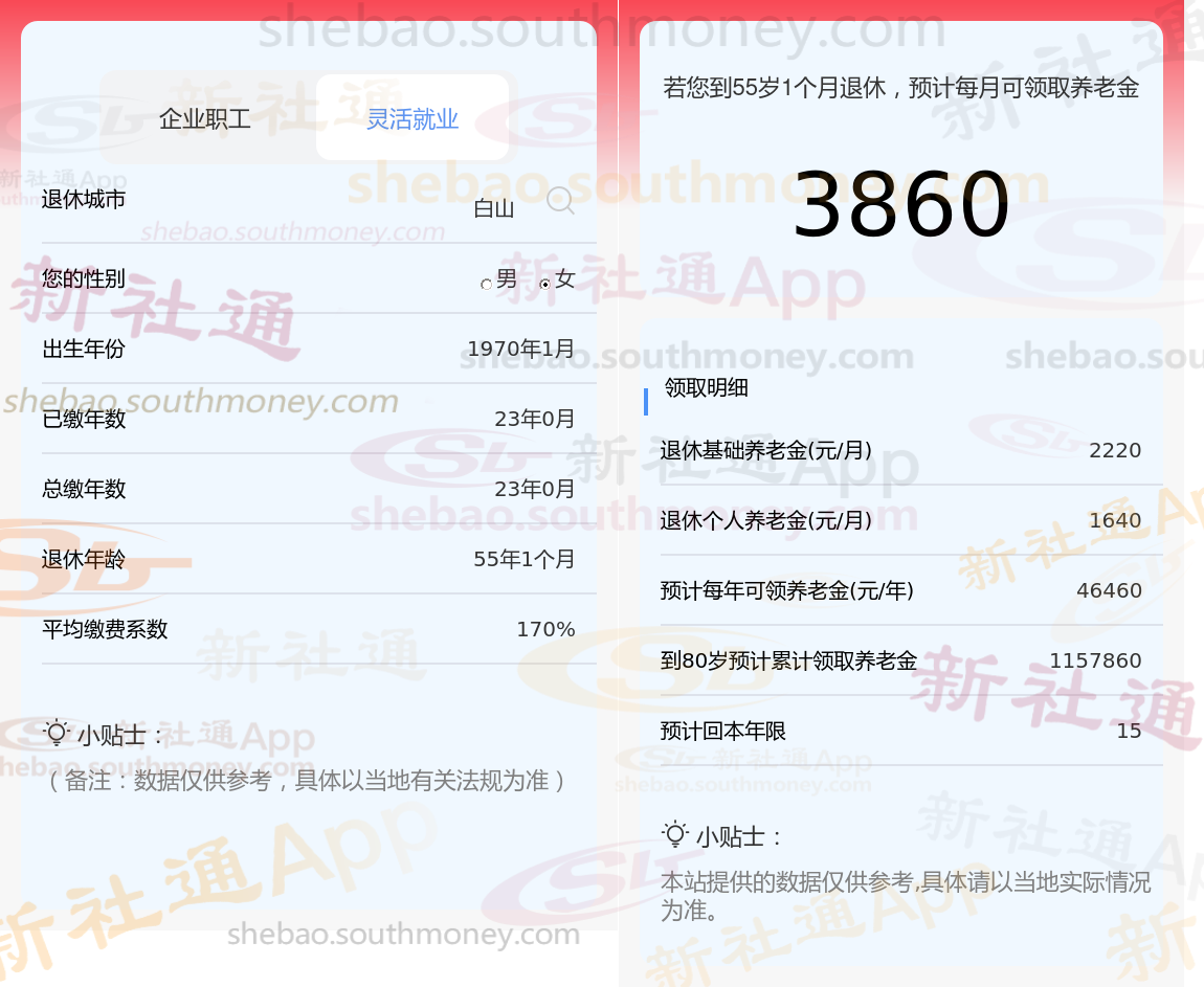 退休城市:白山,性别:女,出生年份:1970,总缴年数23年,缴费档次:170%,新社通app养老金计算器所得: