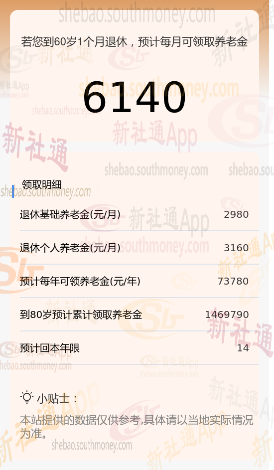 每月可领养老金总额:将基础养老金与个人养老金相加,每月可领取的养老金总额约为6140元(2980元+3160元)。