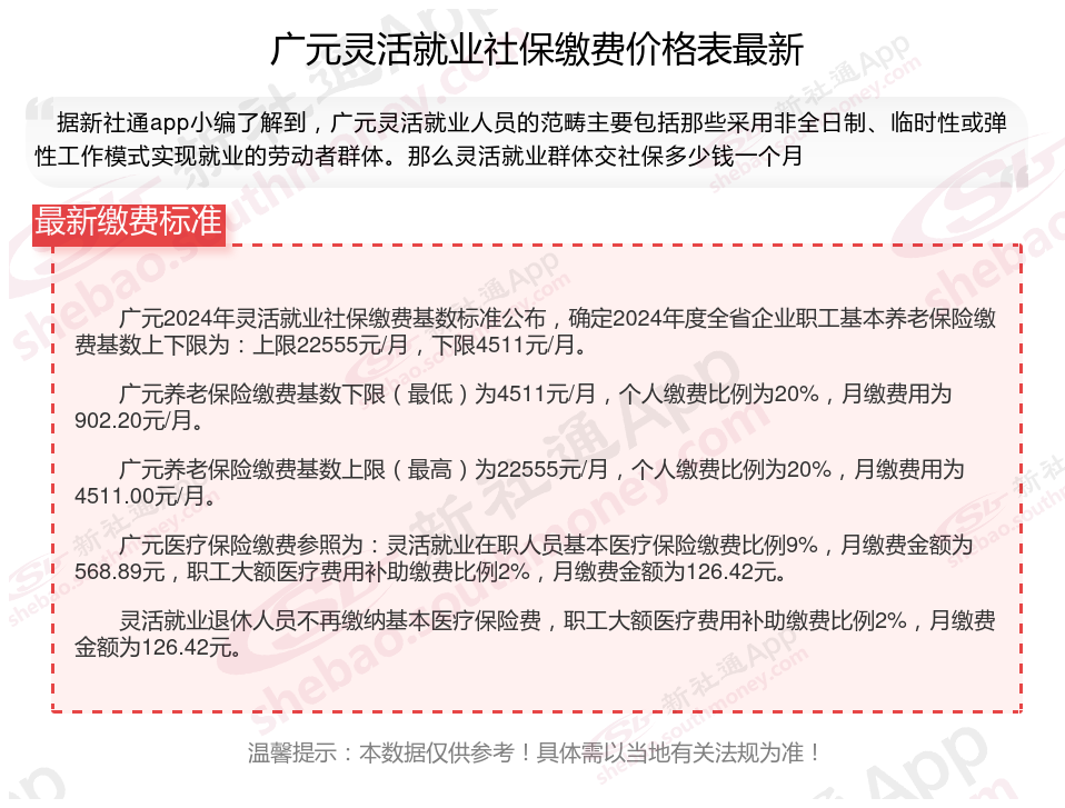 据新社通app数据显示,广元企业灵活就业养老保险的缴费基数为:4511元。