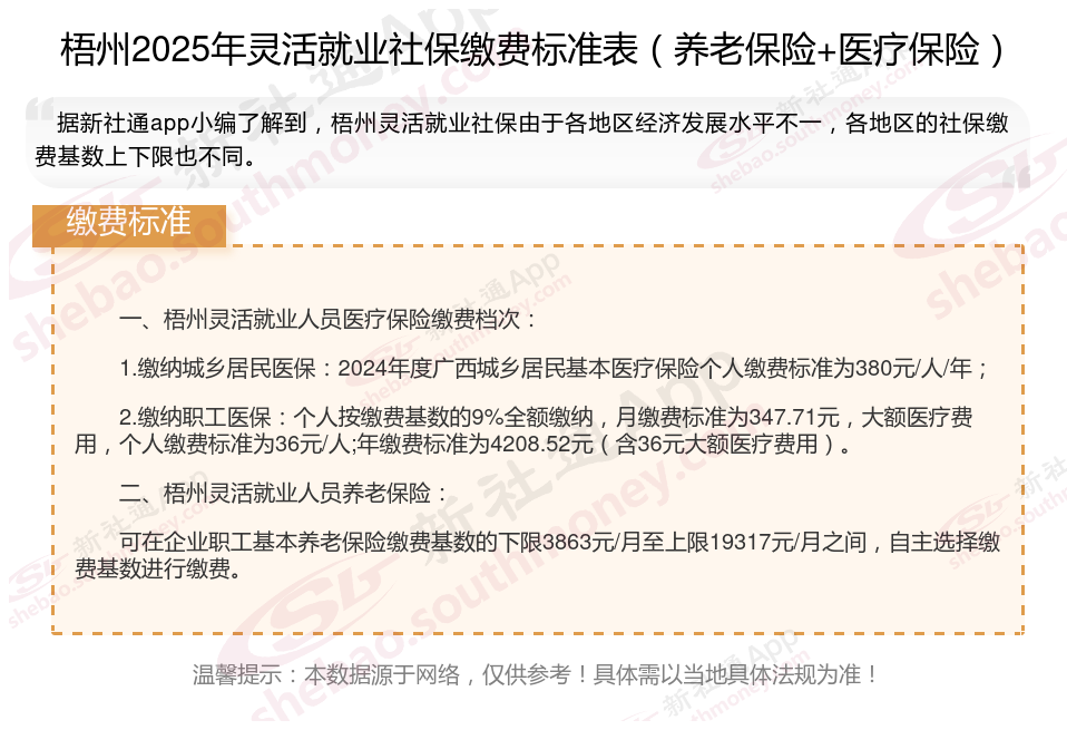 据新社通app数据显示,梧州灵活就业养老缴费基数明细如下: