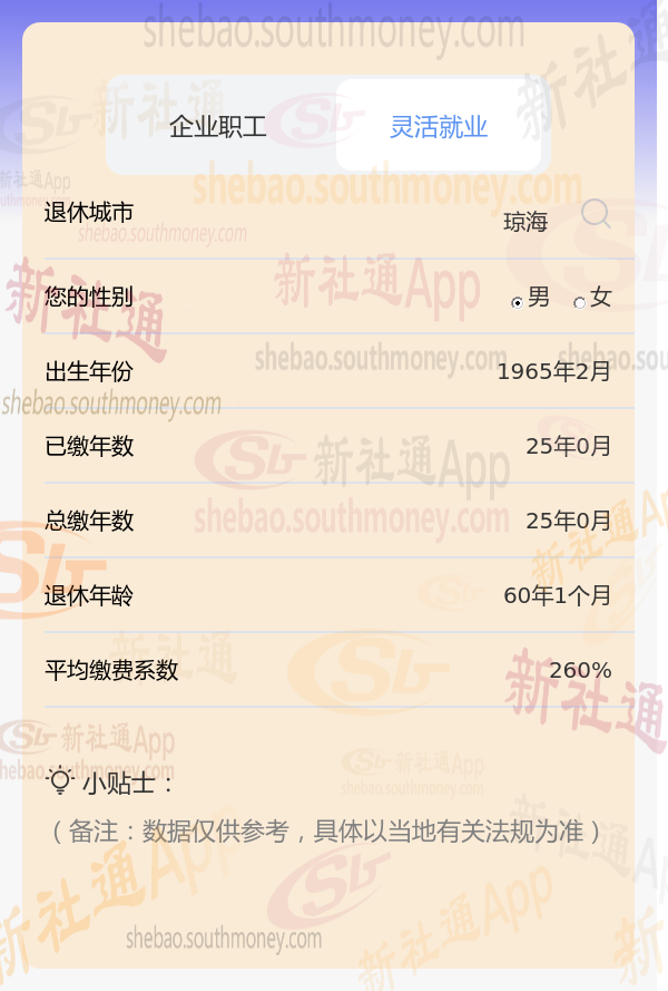 网友刘某退休城市在琼海,性别:男,出生年份:1965为例,假设其按最低标准(缴费系数0.6)缴纳社保,新社通app养老金计算器预设工资增长率等参数为3%。在此情境下,其退休后能领取的养老金数额需通过计算器精确得出,但基于上述条件,预计数额会相对较低。为获准确估算,建议刘某使用计算工具按要求输入个人信息进行计算,具体数额依个人情况及当地法规而定。