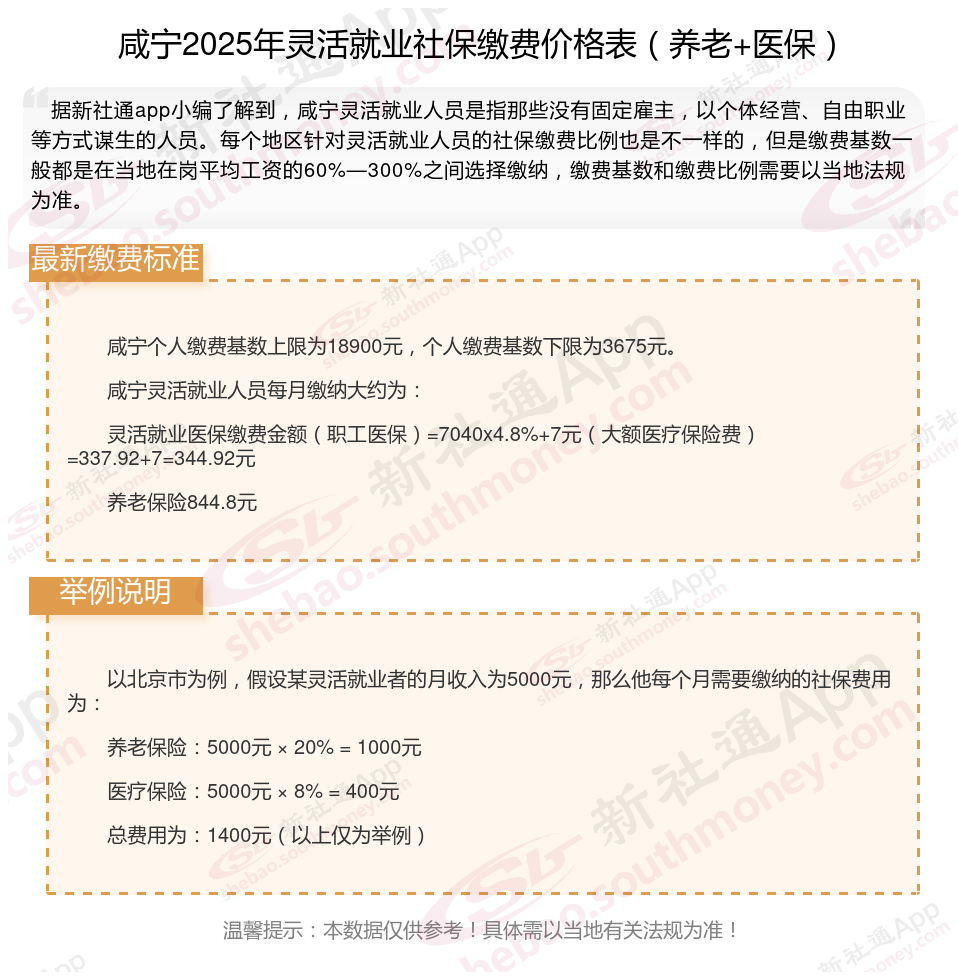 据新社通app数据显示,2024-2025年咸宁灵活就业人员养老保险的缴费标准是根据缴费基数来确定的: